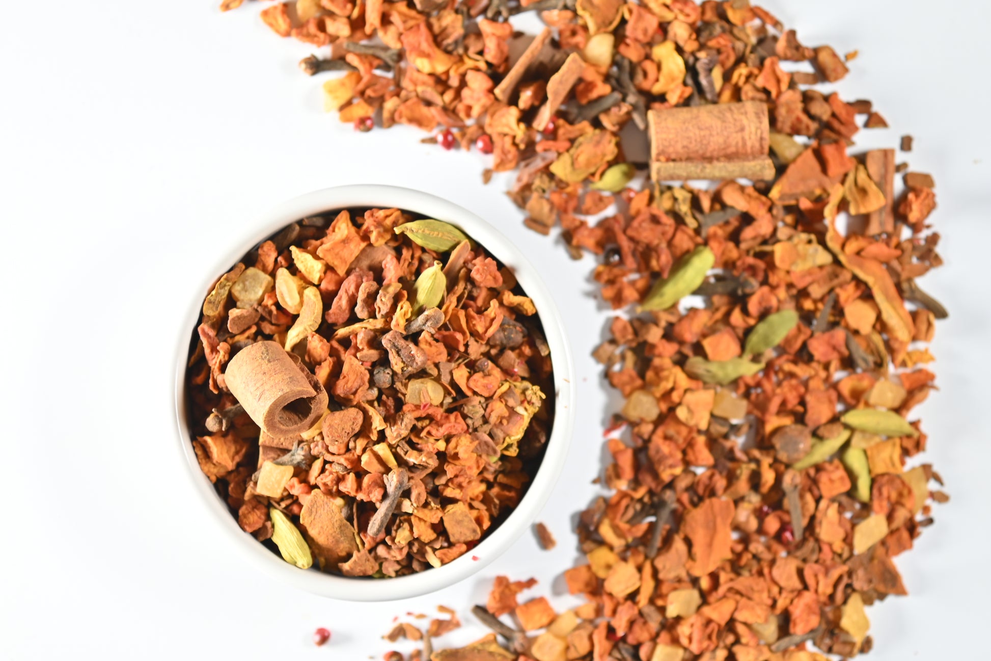 Ingredients: pumpkin cubes, apple pieces, cinnamon pieces, ginger cubes, turmeric roots, cinnamon rods, cloves, cardamom, pink pepper, natural flavoring.